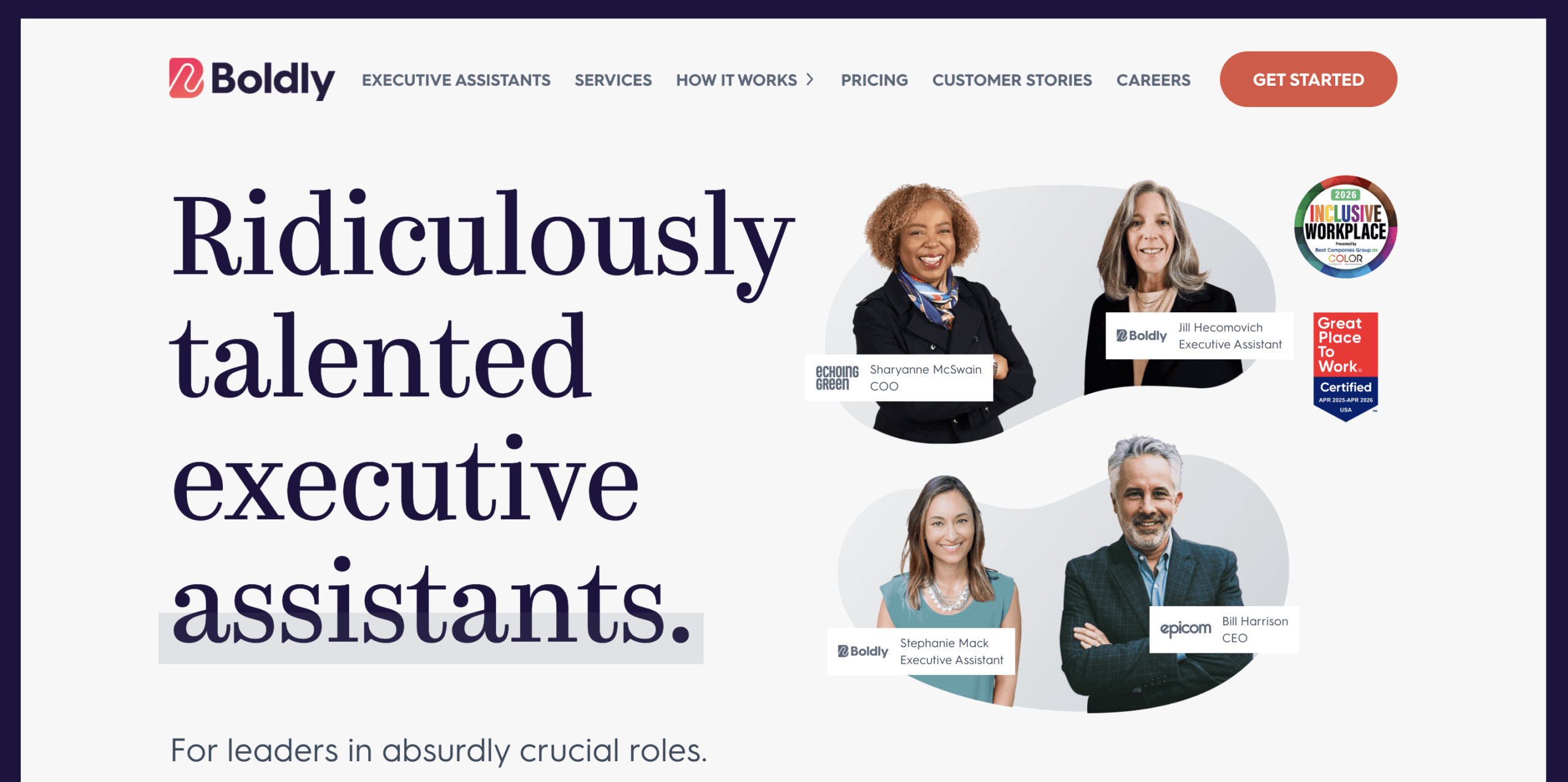 - Why They Stand Out: Great option for demanding execs who can spend a bit more for quality, longevity, legal compliance, and flexibility. Boldly’s hiring process is thorough. They retain their US-based talent with W2 employment, benefits, and a thriving, supportive work culture. As a result, you can count on your dedicated assistant to be part of your team for the long term. Boldly also offers a buy-out program should you want to hire your assistant full-time in the future. Boldly has been rated as a Top Inclusive Workplace, Great Place to Work, Fortune’s Best Company, and more.