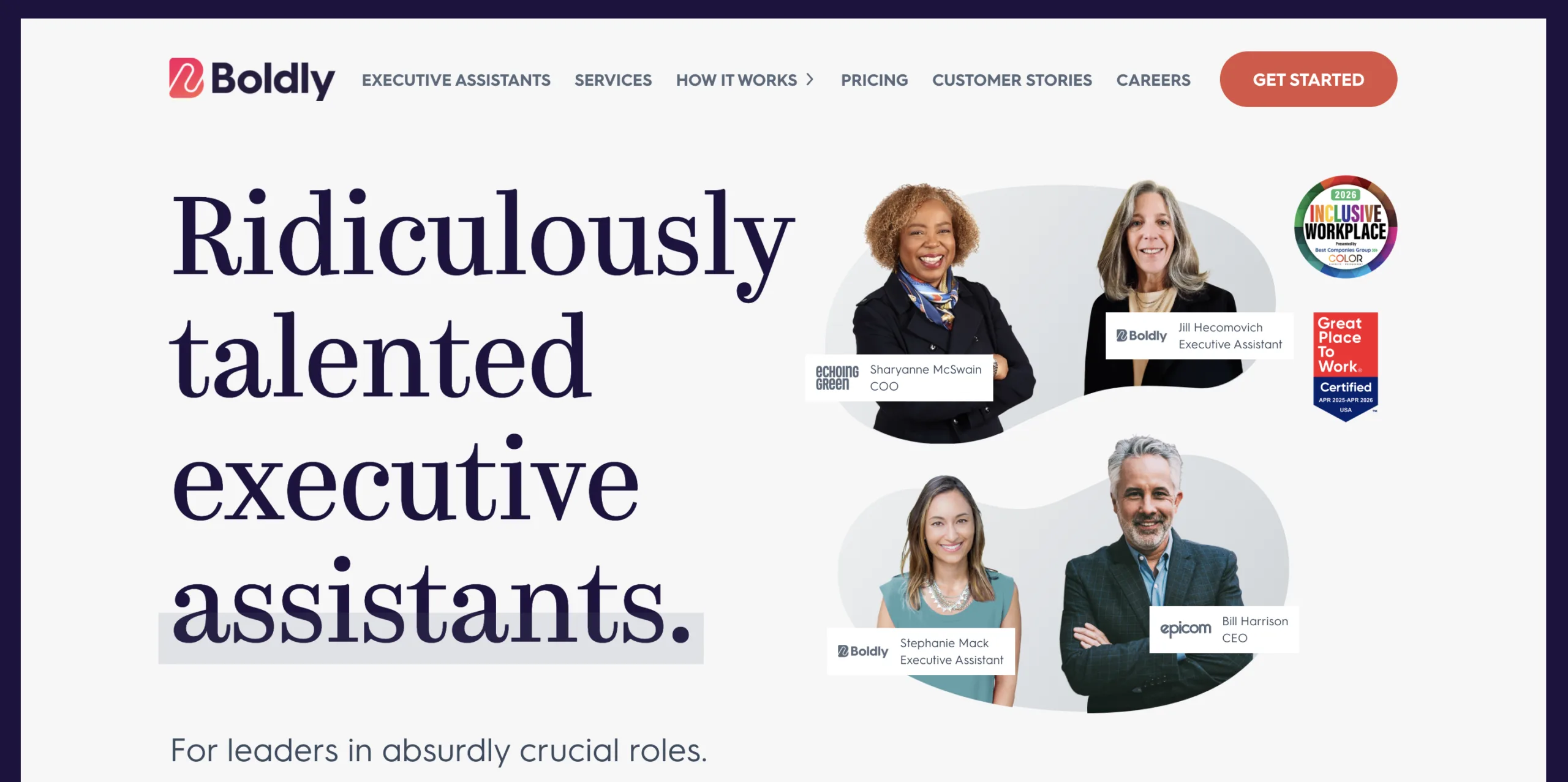 - Why They Stand Out: Great option for demanding execs who can spend a bit more for quality, longevity, legal compliance, and flexibility. Boldly’s hiring process is thorough. They retain their US-based talent with W2 employment, benefits, and a thriving, supportive work culture. As a result, you can count on your dedicated assistant to be part of your team for the long term. Boldly also offers a buy-out program should you want to hire your assistant full-time in the future. Boldly has been rated as a Top Inclusive Workplace, Great Place to Work, Fortune’s Best Company, and more.